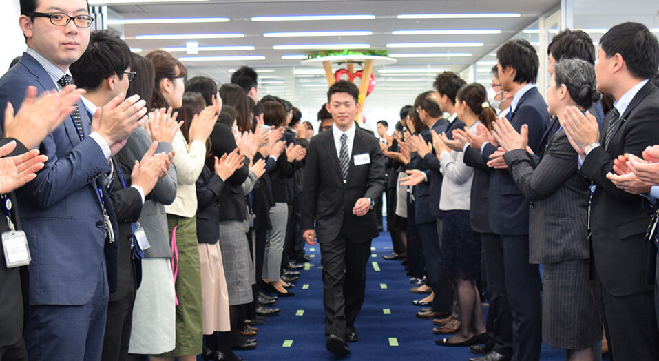 4月1日、日本コンベンションサービスの本社で、2019年春に卒業した新社会人14名を迎えました。全社朝礼では、新卒社員一人ひとりが、自分を漢字一文字に例えた「決意表明」を実施。JCSの社員一同が見守る中、緊張した面持ちでのお披露目となりました。その後は、先輩社員のつくった花道を通り抜けて入社式の会場へ向かいます。