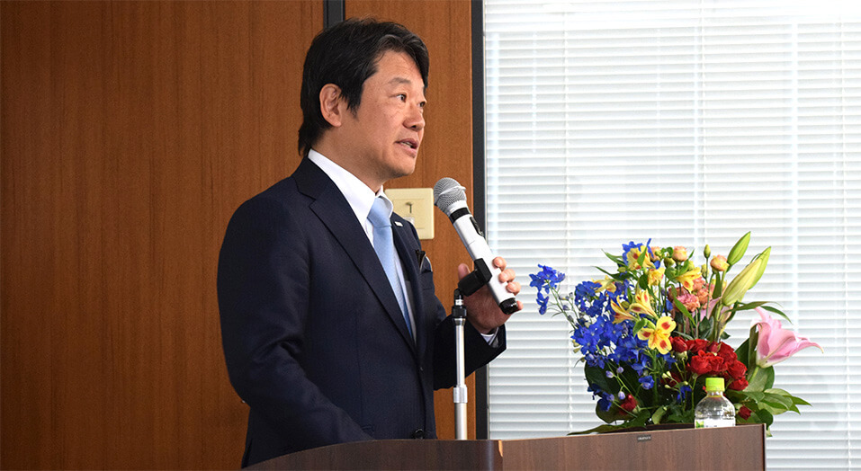 全役員による新卒社員に向けた歓迎メッセージの後、代表近浪はJCSが50年歩んできた中での苦労や、どのようにそれを乗り越えてきたか、そしてクライアントの信頼を得てお受けした仕事に対し、どのように取り組んできたか等を熱く語りました。新卒社員の皆さんは、真剣な眼差しで話に耳を傾けていました。