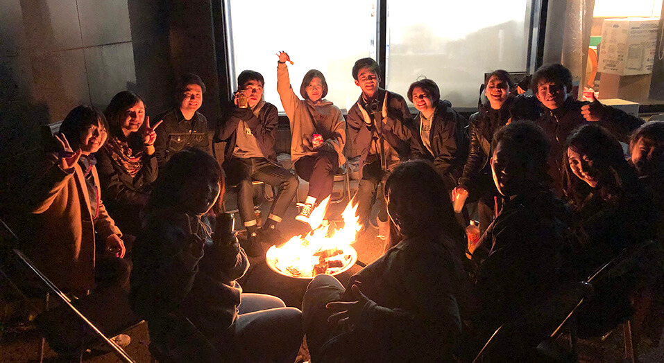夕食は外でBBQ。海沿いの強風の中でしたが、それぞれが火おこしや食材準備などを役割分担しながら夕食を楽しみました。焚火を囲みながら、新卒メンバーは家族のことや働くということ、どのような社会人になりたいか等、熱く語り合っていました。