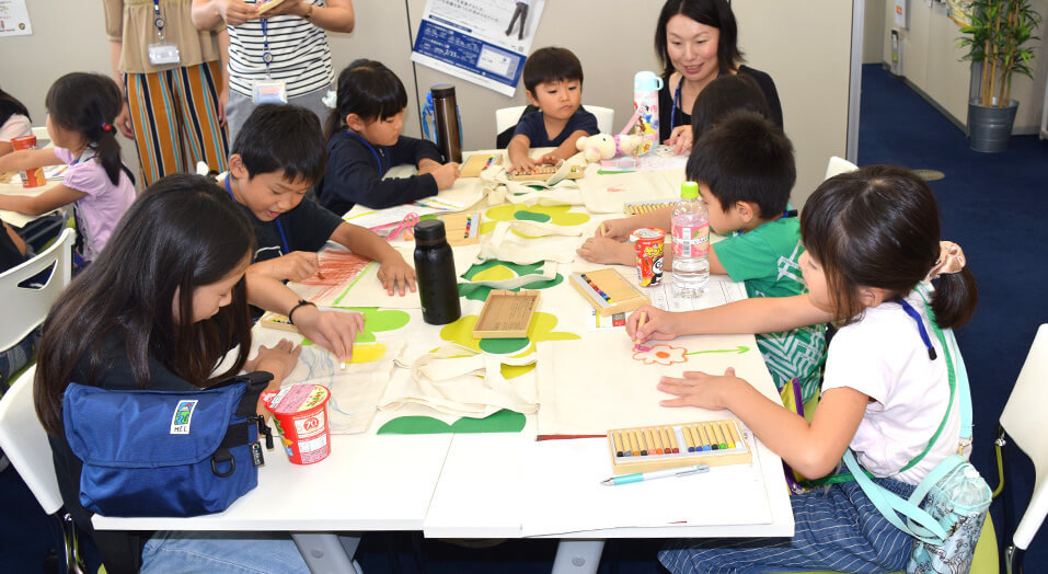 国際会議では、会議の参加者に資料一式が入ったコングレスバック(会議かばん)を渡します。そこで、先ほど実施した「海洋プラスチックごみ問題」に関連づけ、子どもたちは“エコバック仕様”のコングレスバックを制作しました。プラスチックごみを減らすために自分ができる事を考えながら、世界に一つだけのオリジナル作品を創りました。