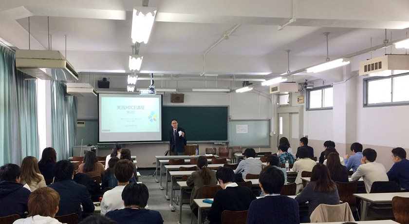 学生からは「IR=カジノではないことが理解できた」「法案の整備や住民の理解、監督省庁を決めることなど課題を認識することができた」「私も海外のIRに行ってみたいと思った」などの感想がありました。実践MICE講座では、当社社員が講師を担当し、MICEの基礎知識から、IR、国際会議、医歯薬学会、通訳・翻訳、展示会、コンベンションビジネスと地方創生、自治体との連携まで、学生に幅広くMICEについての理解を深めてもらうことを目的に取り組んでいます。