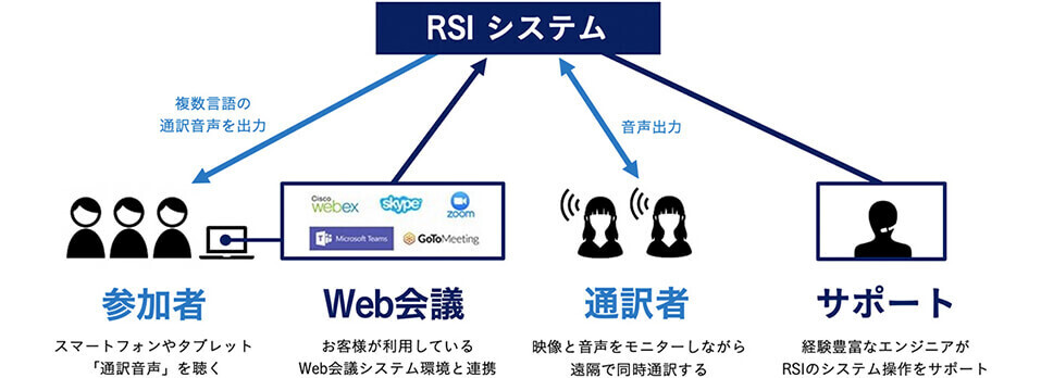 RSI(Remote Simultaneous Interpretation)とは遠隔同時通訳のことで、会議の参加者はインターネットを通じて、場所を問わず、あらゆる言語の同時通訳を利用することができるシステムです。