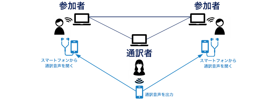 Zoom以外のWeb会議システムで同時通訳を行うためには、会議参加者が発言するためのメイン回線と、通訳音声を聞き取るためのサブ回線の2回線が必要です。通訳を利用する参加者は、この2回線を準備しなければなりません。