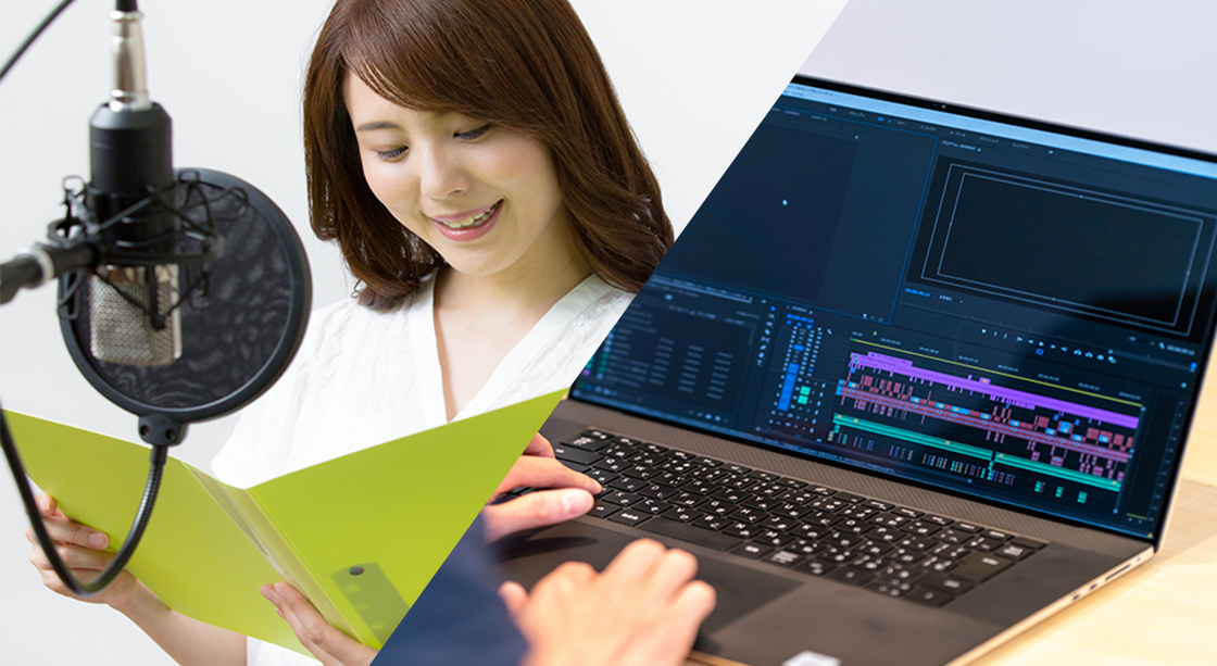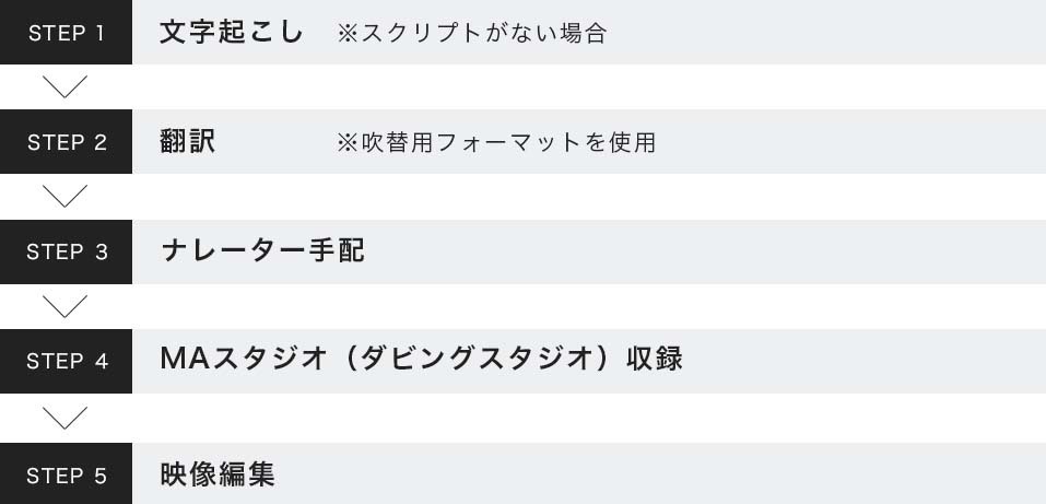 文字おこし ※スクリプトがない場合 → 翻訳 ※吹替用フォーマットを使用 → ナレーター手配 → MAスタジオ(ダビングスタジオ)収録 → 映像編集