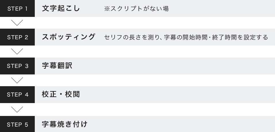 文字おこし ※スクリプトがない場合 → スポッティング(セリフの長さを測り、字幕の開始時間・終了時間を設定する) → 字幕翻訳 → 校正・校閲 → 字幕焼き付け