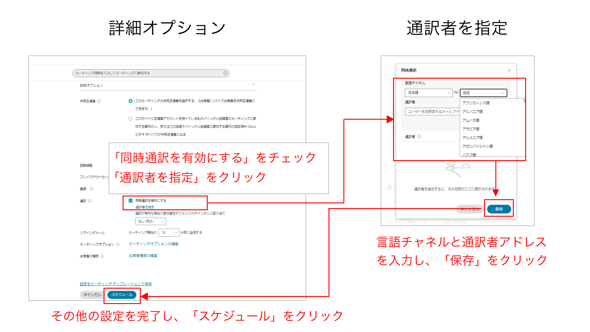 Webex Meetings デスクトップ アプリから会議をスケジュールし、ブレイクアウトセッションを設定する場合、同時通訳機能は利用出来ません。