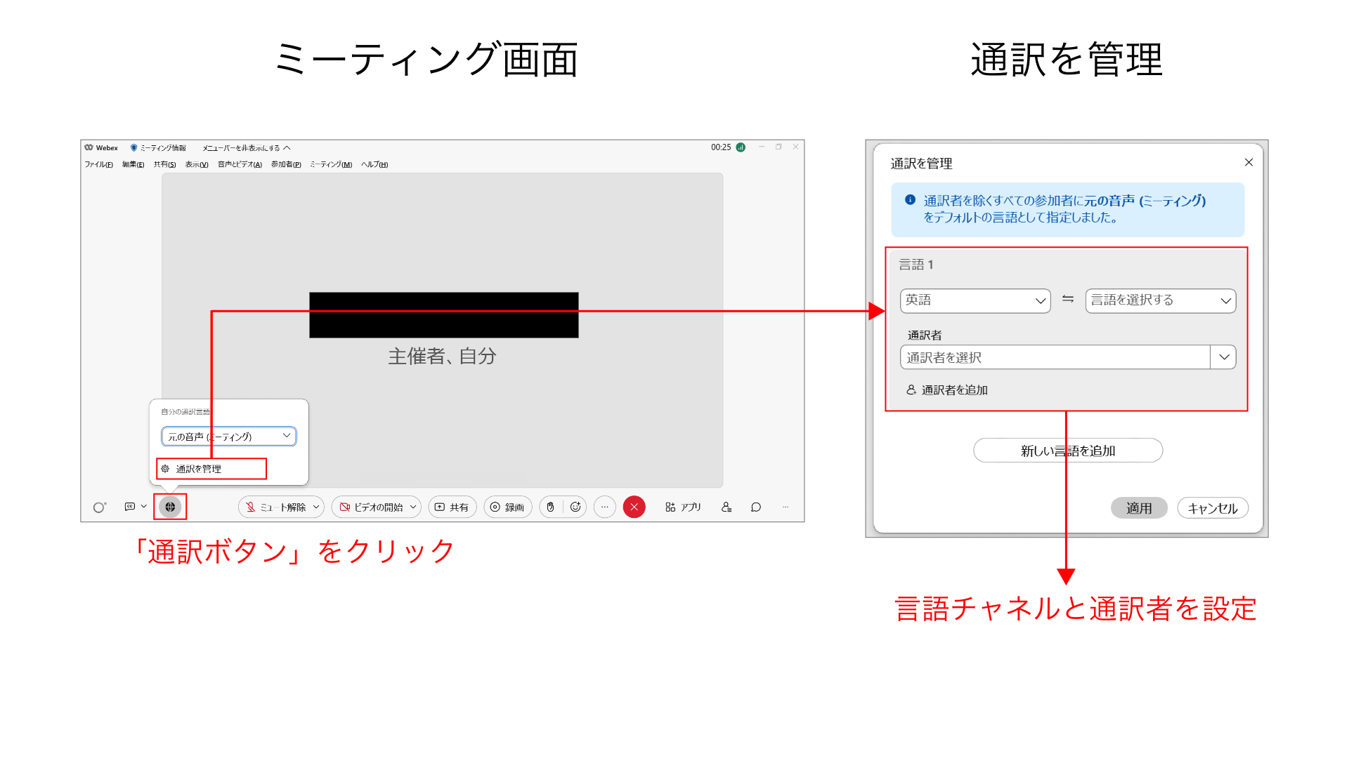 ここでは、同時通訳機能を使って、ミーティングを主催する方法について具体的に説明します。