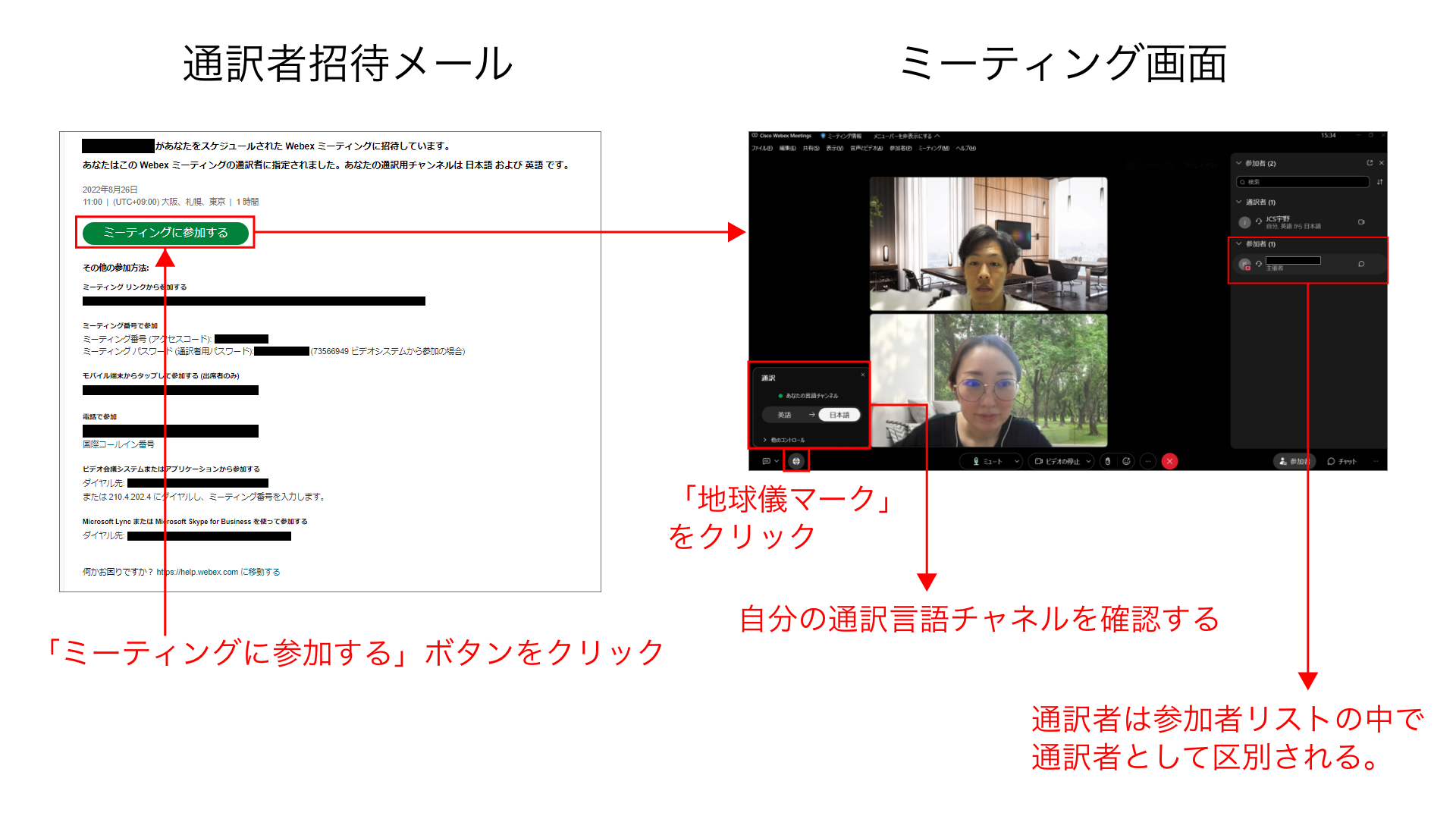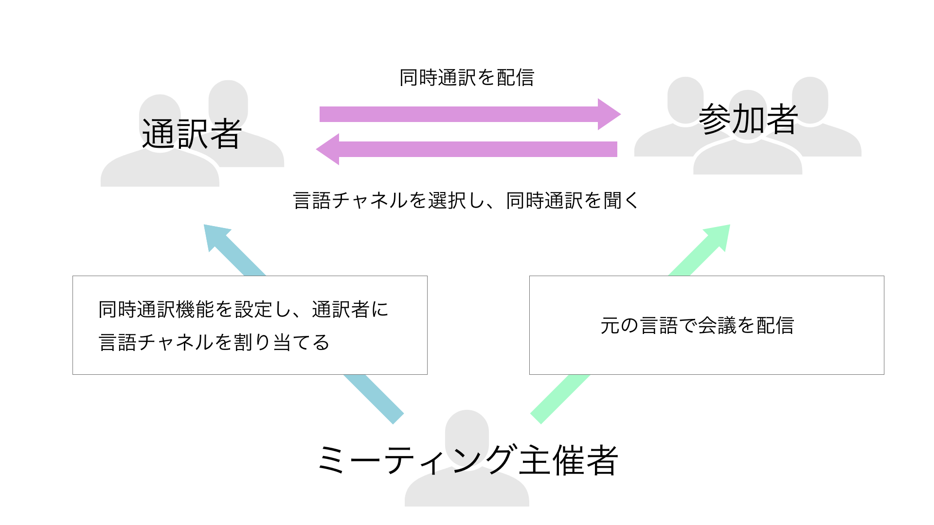 ここでは、ミーティング参加者が同時通訳を聞く方法について説明します。