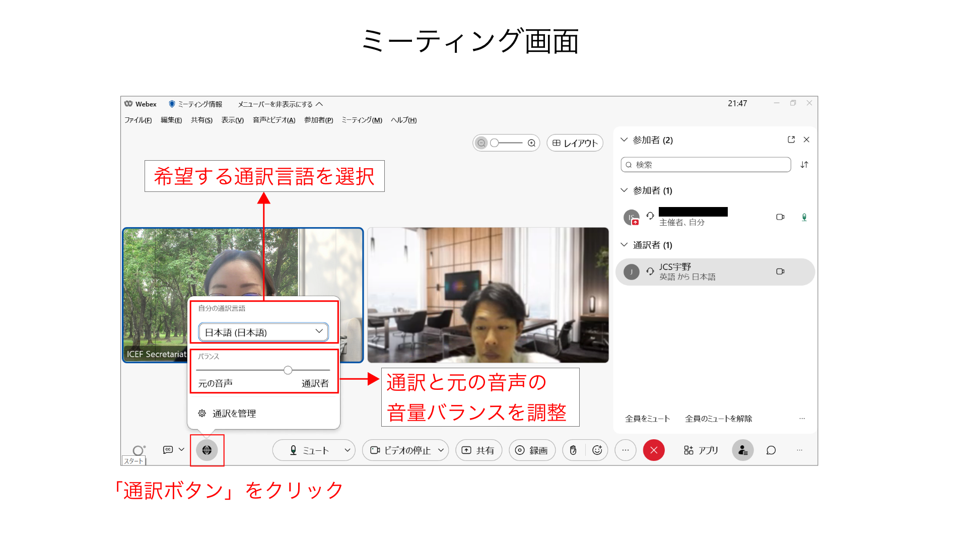同時通訳機能は、ミーティング開始後でも設定可能です。ここでは、ミーティング中に通訳者と言語チャネルを設定する方法について具体的に説明します。