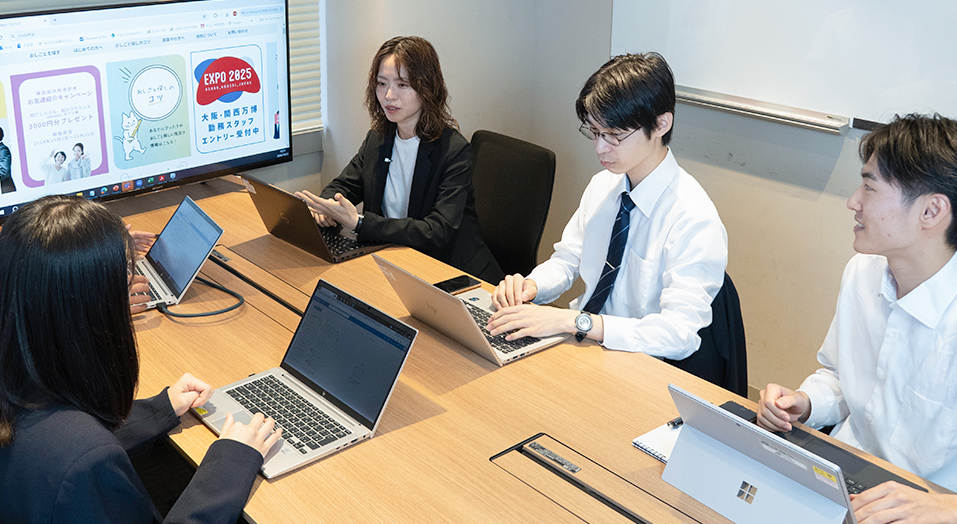 A.L. 退勤前にメールやチャットを全て確認し、必要に応じて返信します。大阪・関西万博プロジェクトで大阪へ出張することもありますが、業務を行う場所は基本的には社内が多いです。 土日に開催される他チームのイベントなどをサポートすることもありますが、振替休日を平日に取得できているので、苦ではありません。