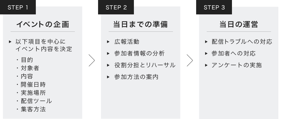 オンラインイベントを実施するためには、どのような点に注意する必要があるのでしょうか。ここでは、オンラインイベントの企画段階から、準備、開催当日に至るまでの手順を詳しく解説していきます。