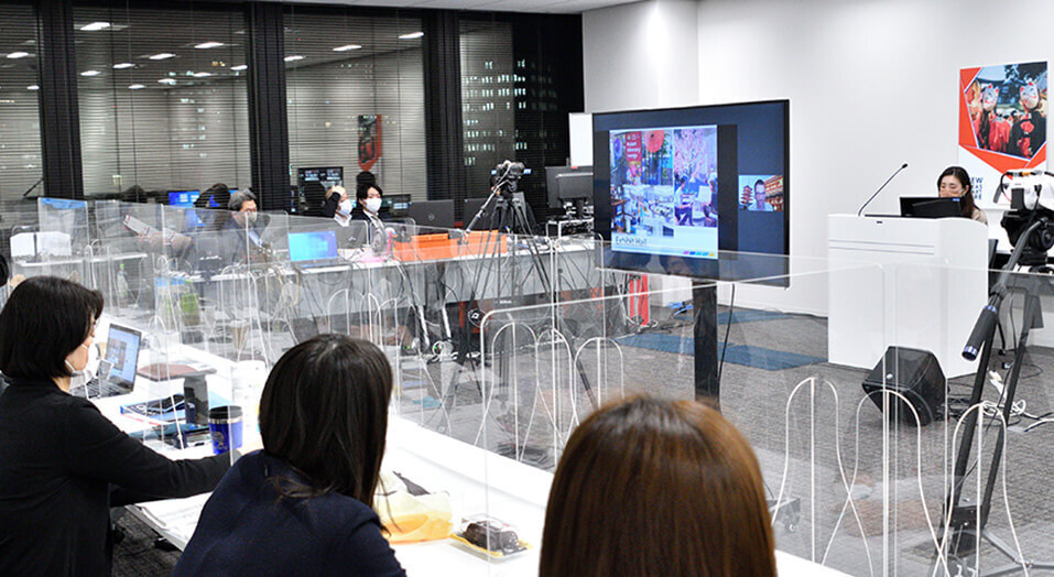 休業中の社員や内定者を含め、300人以上がリモートで参加した社員総会。社内会議室に本格的な「配信スタジオ」を設営し、映像機器やカメラを持ち込んでライブ映像を配信しました。Zoomのブレイクアウトセッション機能を使って実施したグループゲームでは、全社員に事前に配った「グッズ」の活用や、社員一人ひとりに役割を持たせるといったオンラインでも飽きない企画が好評でした。緻密に設計された企画とグループ会社による高品質の映像配信で、8割を超える参加者が「満足」と回答しました。