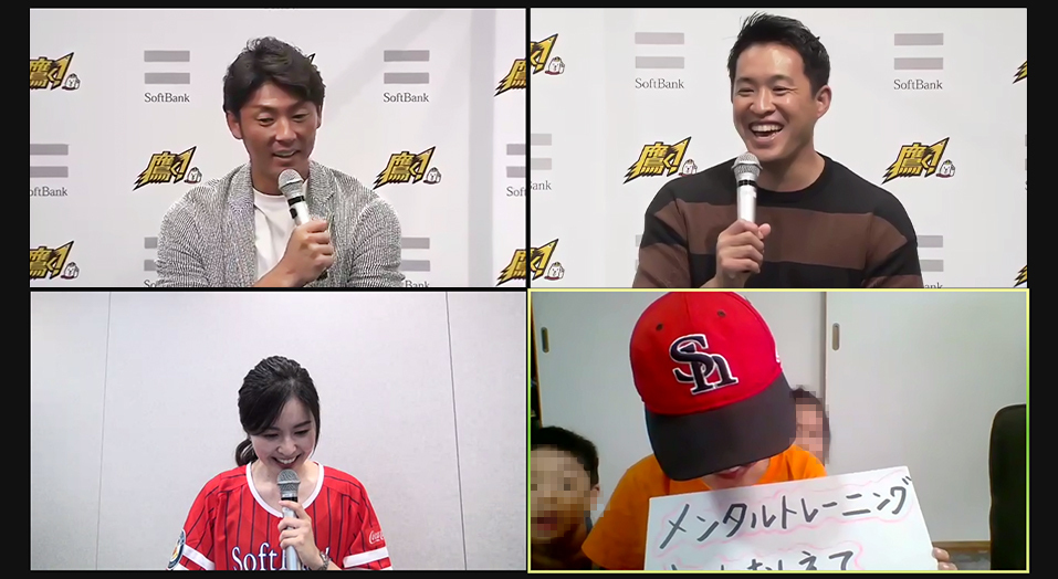 プロ野球のOB選手と、ファンがオンラインで交流した「ソフトバンクホークス オンラインファンミーティング」を行いました。ここでしか聞けないフリートークや、投票機能を使ったお絵かき対決、トークイベント選手との対話など、参加者全員が楽しめるようプログラムを設計しました。