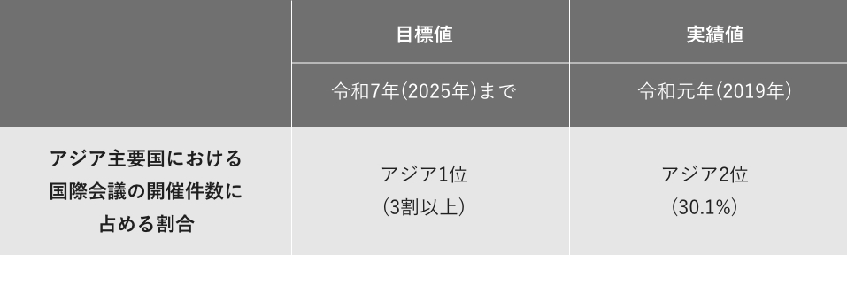 日本政府が2023年3月に定めた「観光立国推進基本計画」では、経済効果やビジネス機会・イノベーションの創出、国や開催地のブランド力等の向上などの観点から、MICE の日本への誘致・開催を強化するとしています。その具体的目標としてアジア主要国における国際会議の開催件数に占める日本開催の割合を2025年までにアジア1位(3割以上)にすることを目指しています。