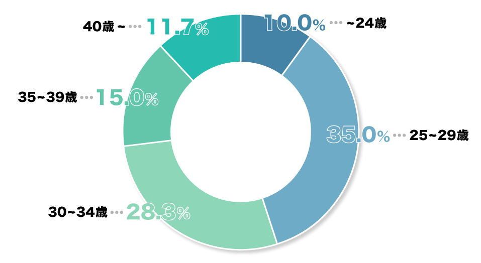 30代前半までに当社に転職される方が多く、全体の7割を占めます。若い方の場合は即戦力としての活躍を期待して、また30代後半以上の方にはマネージャー(管理職候補)としての活躍を期待して選考させていただいております。少しでも当社に関心を持たれた方は、遠慮なくお問い合わせください。