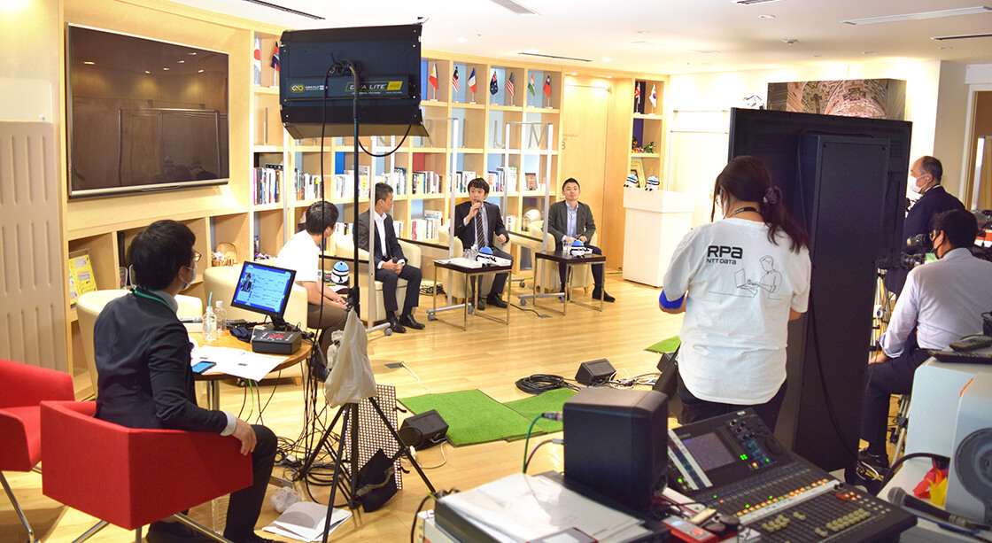 今回、3つのタイムスケジュールを並行する形で各種プログラムを実施しました。NTTデータ様のオフィス内にある各ブースエリアにて、セッション映像を配信するための「特設スタジオ」を設営。それぞれにオンラインイベント用の映像機材を設置し、専門オペレーターを手配しました。さらに、「絵づくり」に必要不可欠な照明機材も使用して、高いクオリティのライブ配信に拘りました。