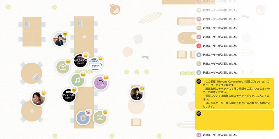 オンライン上のネットワーキングとAI字幕翻訳は、いずれも福岡のスタートアップ企業が技術(サービス)を提供しました。参加者と登壇者をつなぐ「オンラインネットワーキング」は、workeasy株式会社が開発したツール「workle(ワークル)」で実現。「workle」は、オンライン上の「自分のアイコン」を好きな場所に動かして、近くの参加者と簡単にコミュニケーションがとれるUI/UXが大きな特徴です。さらに画面上のチャット機能を利用すると、インタラクティブなコミュニケーションをとることもできます。「AI字幕翻訳」は、株式会社ユニゾンシステムズが提供する「Join-View」という翻訳サービスを使いました。AIが「自動翻訳」と「文字起こし」を同時に処理し、リアルタイムでライブ映像に字幕表示するので、オンライン上でも有効な国際コミュニケーションが可能になりました。自動翻訳が難しいプログラムでは、JCSが提供するRSIシステム「オンライン同時通訳」を使用し、スムーズな通訳を実現しました。